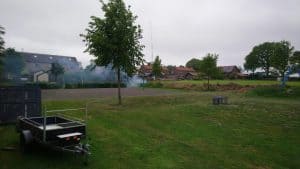 De rietwal tussen het speelveldje en het weiland daarachter stond in brand. De politie zegt dat onkruidverdelger mogelijk de oorzaak is maar daar wordt nog onderzoek naar gedaan.