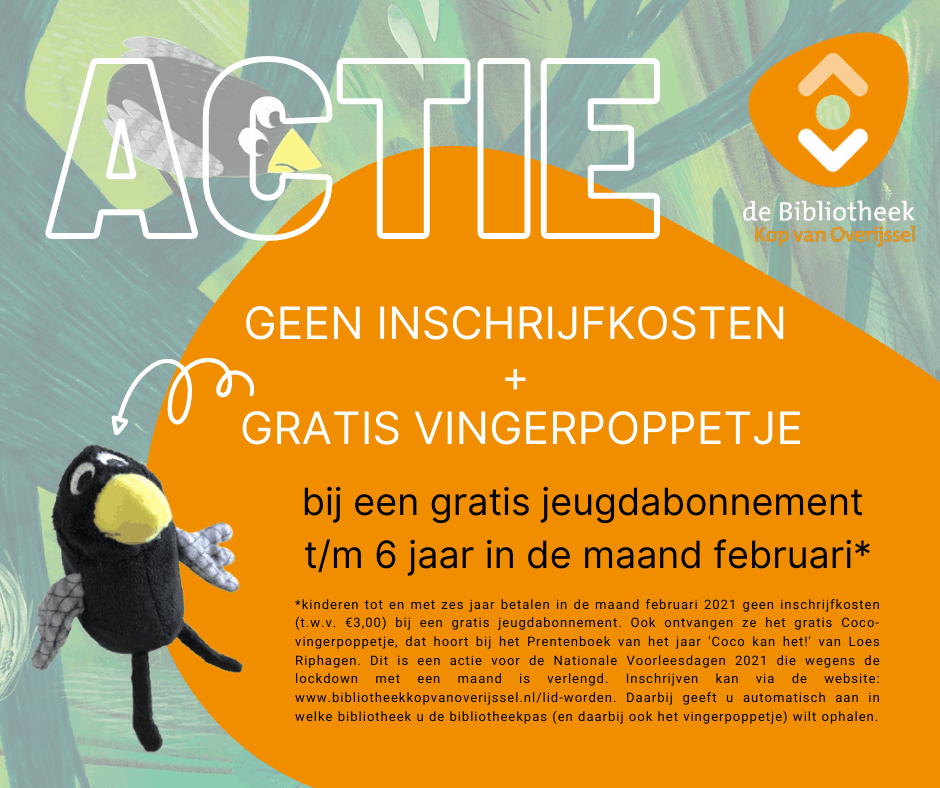 In de maand februari betalen kinderen tot en met zes jaar geen inschrijfkosten (€3,-) bij een gratis jeugdabonnement. Daarnaast ontvangen zij gratis het vingerpoppetje dat hoort bij het Prentenboek van het jaar, Coco kan het! van Loes Riphagen.