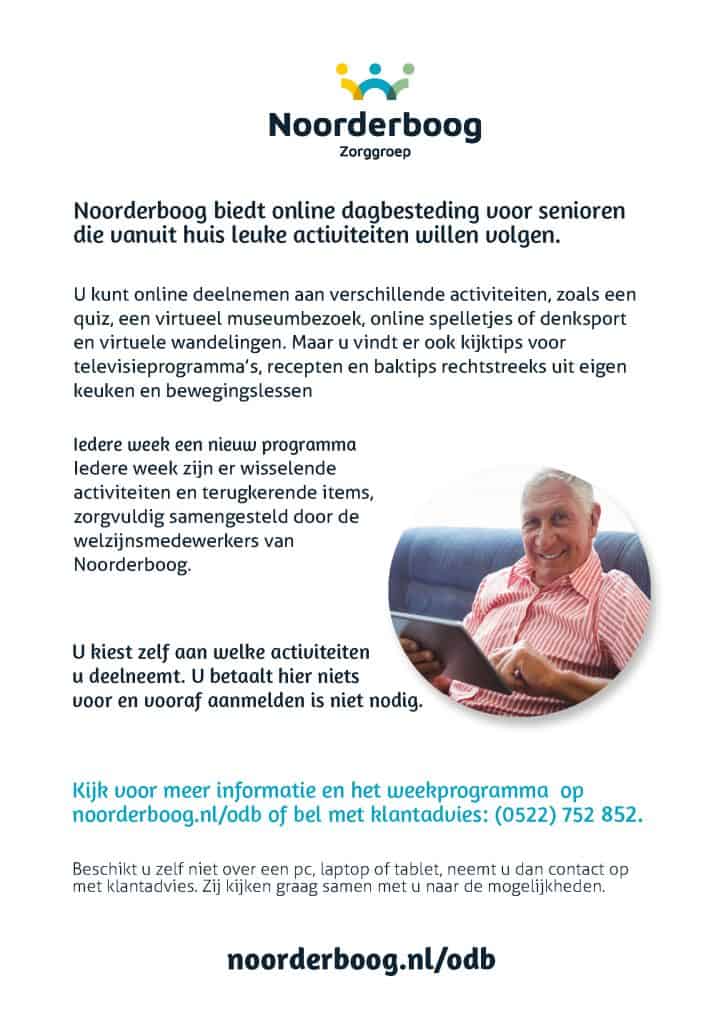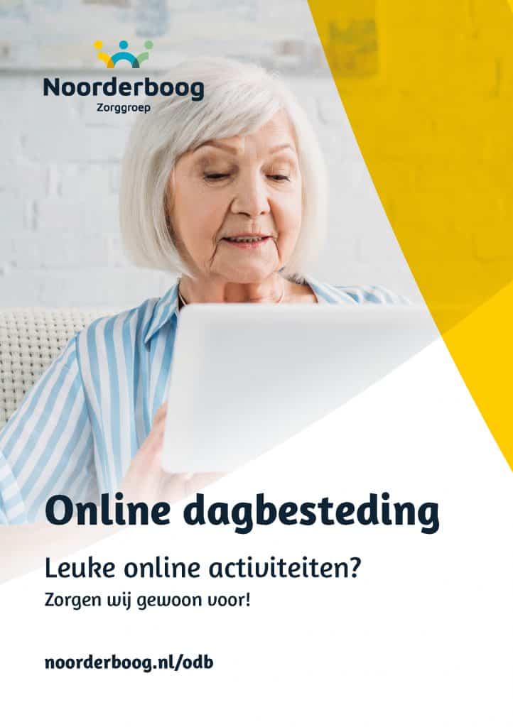 Op de verschillende woonlocaties van Noorderboog worden altijd veel activiteiten georganiseerd voor bewoners en belangstellenden uit de buurt. Voor senioren die liever vanuit huis leuke activiteiten willen volgen, komt Noorderboog nu met online dagbesteding. De wens om online dagbesteding beschikbaar te stellen is ontstaan in coronatijd, toen fysieke dagbesteding lastig of onmogelijk was. Maar ook na corona zal online dagbesteding een innovatieve manier zijn om dagbesteding aan te bieden. Dit kan een uitkomst zijn voor mensen die vanwege een lichamelijke beperking (tijdelijk) niet naar de dagbesteding kunnen komen of de drempel naar fysieke dagbesteding te hoog vinden of voor mensen die gewoonweg liever vanuit huis leuke activiteiten willen volgen. De online dagbesteding is gratis beschikbaar voor iedereen. Zij hoeven geen cliënt te zijn van Noorderboog en vooraf aanmelden is niet nodig.
