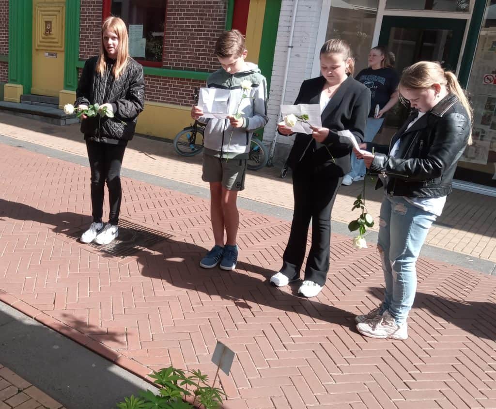Op 4 mei om vier uur stonden in de Irisstraat drie kinderen stil bij drie Stolpersteine. Voor de meivakantie gaf juf Marcia van Basisschool De Samensprong les over de oorlog, over de oorlog nu in 2022 in Oekraïne maar ook over de oorlog in Nederland tussen 1940 en 1945.