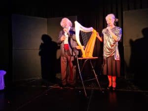 Jeske van Hemert en Luc van den Engh komen het mooie, intiem ingerichte podium op en starten hun programma met: “Ja zuster, nee zuster”. Het ene liedje van Annie MG volgt het andere op. De liedjes worden onderbroken door leuke sketches in mooie kostuums. Een van de hele mooie nummers deze middag is: “Vluchten kan niet meer”. Ooit een succesnummer van Frans Halsema en Jenny Arean en nu op de harp begeleid door Jeske zelf.