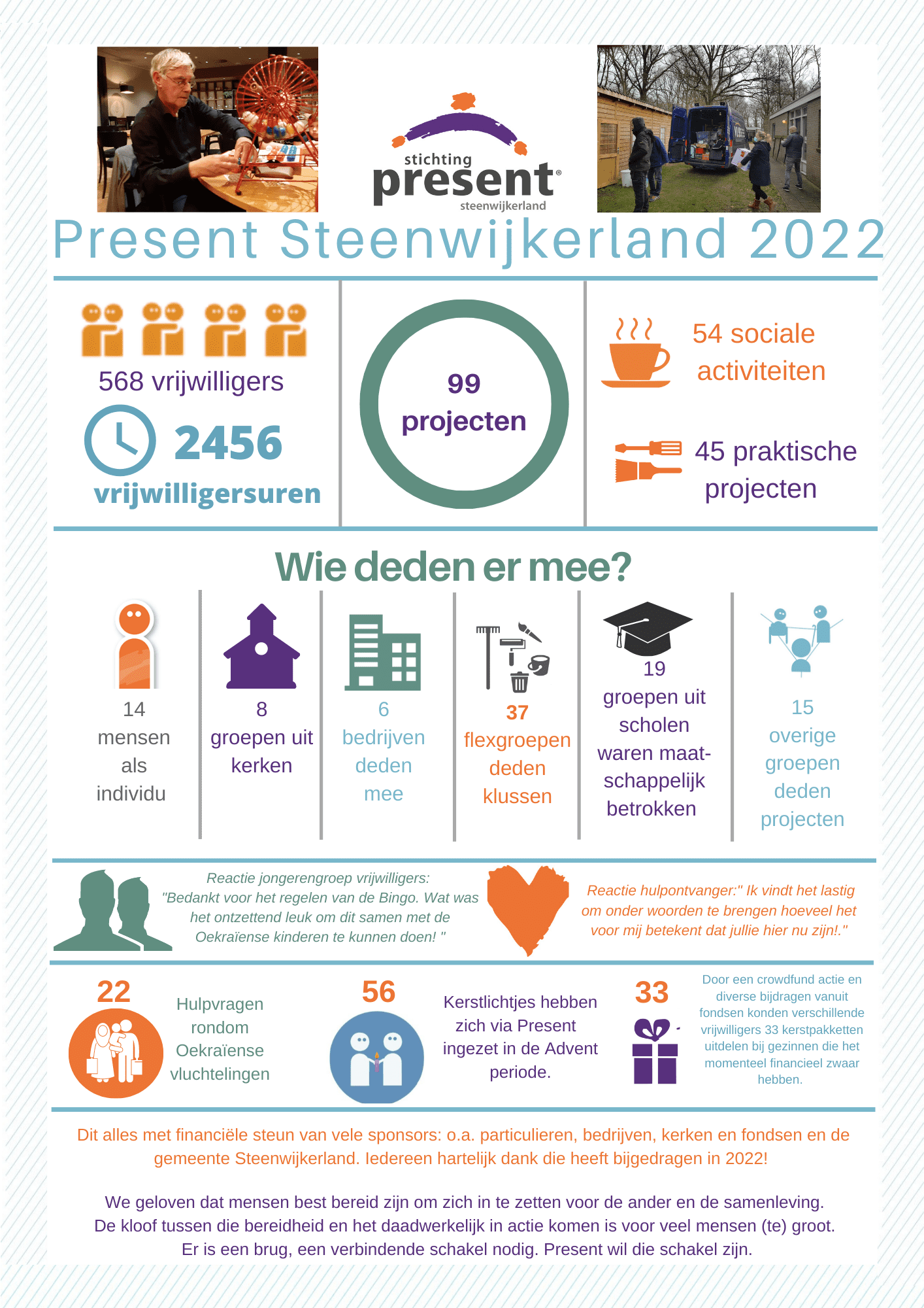 Ook op sociaal gebied is Present actief. Van wandelen, iets lekkers bakken tot het Kerstlicht. Maar liefst 54 keer is dit in 2022 gebeurd. Bij die 99 projecten zijn de getallen van het kerstlicht, zomertassen en kerstpakketten niet eens meegeteld! De getallen laten echter niet zien hoeveel vrijwilligers zich eenmalig hebben ingezet via Present. In totaal hebben zich 568 vrijwilligers zich ingezet voor de inwoners van Steenwijkerland! Al deze informatie komt samen in een infographics. Dat is een document waarop het heel overzichtelijk word weergegeven. Deze zal medio februari verschijnen op onze website en sociale media. Neem gerust een kijkje!