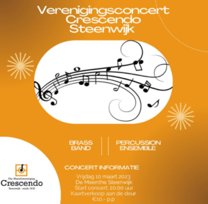 Vrijdag 10 maart om 20:00 geeft muziekvereniging Crescendo Steenwijk een voorjaarsconcert in het Vestzaktheater in De Meenthe.