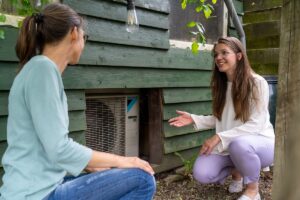 Huiseigenaar Diederik geeft buurtgenoten uitleg over duurzame maatregelen in zijn tiny house