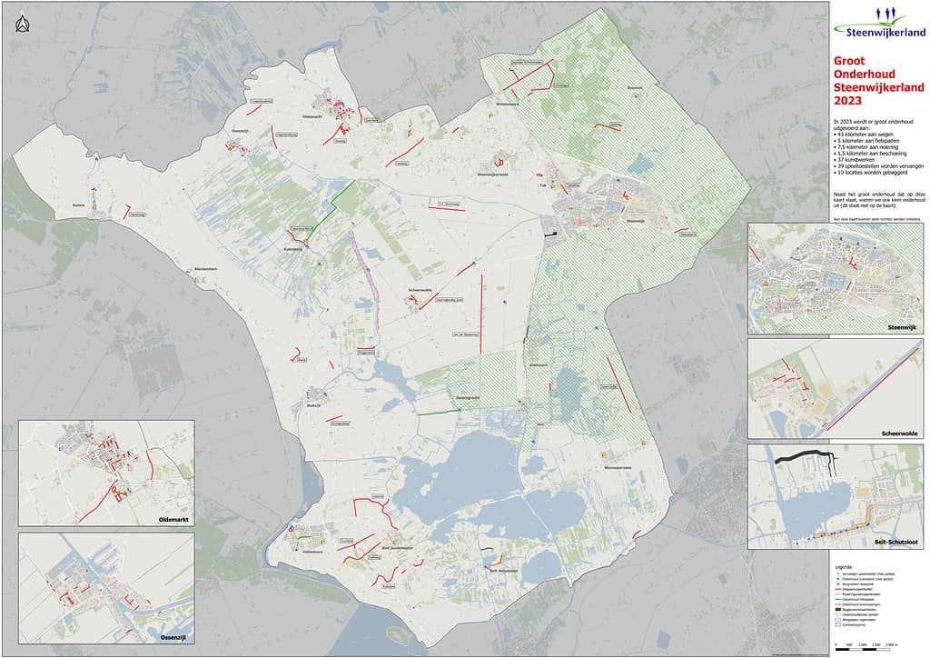 De komende periode wordt er letterlijk flink aan de weg getimmerd in de gemeente Steenwijkerland. Het is onderdeel van het groot onderhoud dat de gemeente dit jaar gaat uitvoeren in de openbare ruimte. Wethouder Melvin Smit: ‘En dan hebben we het onder andere over het verbeteren en vernieuwen van wegen, fietspaden, riolering, beschoeiing, bruggen, speeltoestellen en ook grote snoeiwerkzaamheden. Om dat voor iedereen inzichtelijk te maken, hebben we een kaart gemaakt waarop te zien is waar we in de gemeente aan de slag zijn en gaan voor groot onderhoud.’ De overzichtskaart is te vinden op de gemeentelijke website www.steenwijkerland.nl/grootonderhoudsteenwijkerland