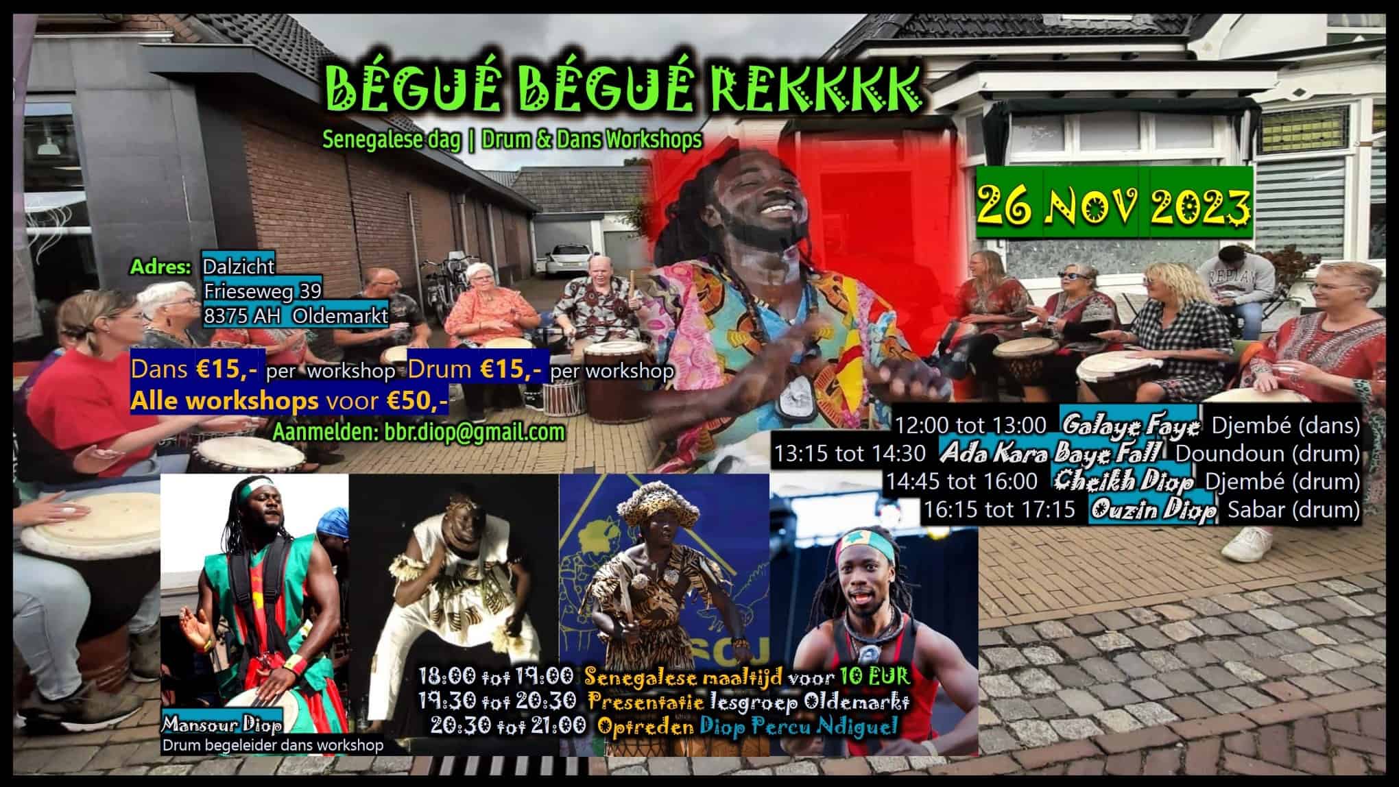 Voor de planning is het belangrijk tijdig aan te melden via: bbr.diop@gmail.com Vermeld daarbij aan welke workshop en/of de maaltijd je mee wil doen.