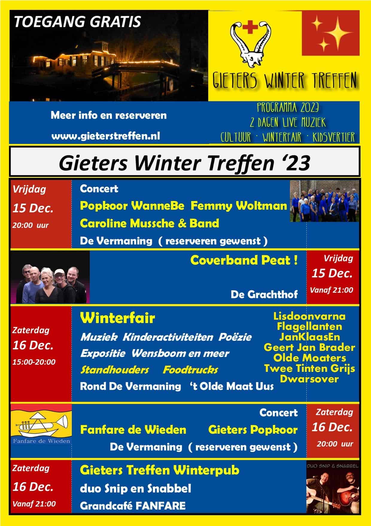 Verleden jaar werd tijdens het koudste weekend van 2022 het zeer succesvolle eerste Gieters Winter Treffen georganiseerd. Dit jaar zullen in het historisch centrum van Giethoorn rondom de Vermaning en ’t Olde Maat Uus weer vele kramen worden opgesteld terwijl in de kerk en onder de Hooiberg diverse muziekgroepen sfeervolle muziek spelen.