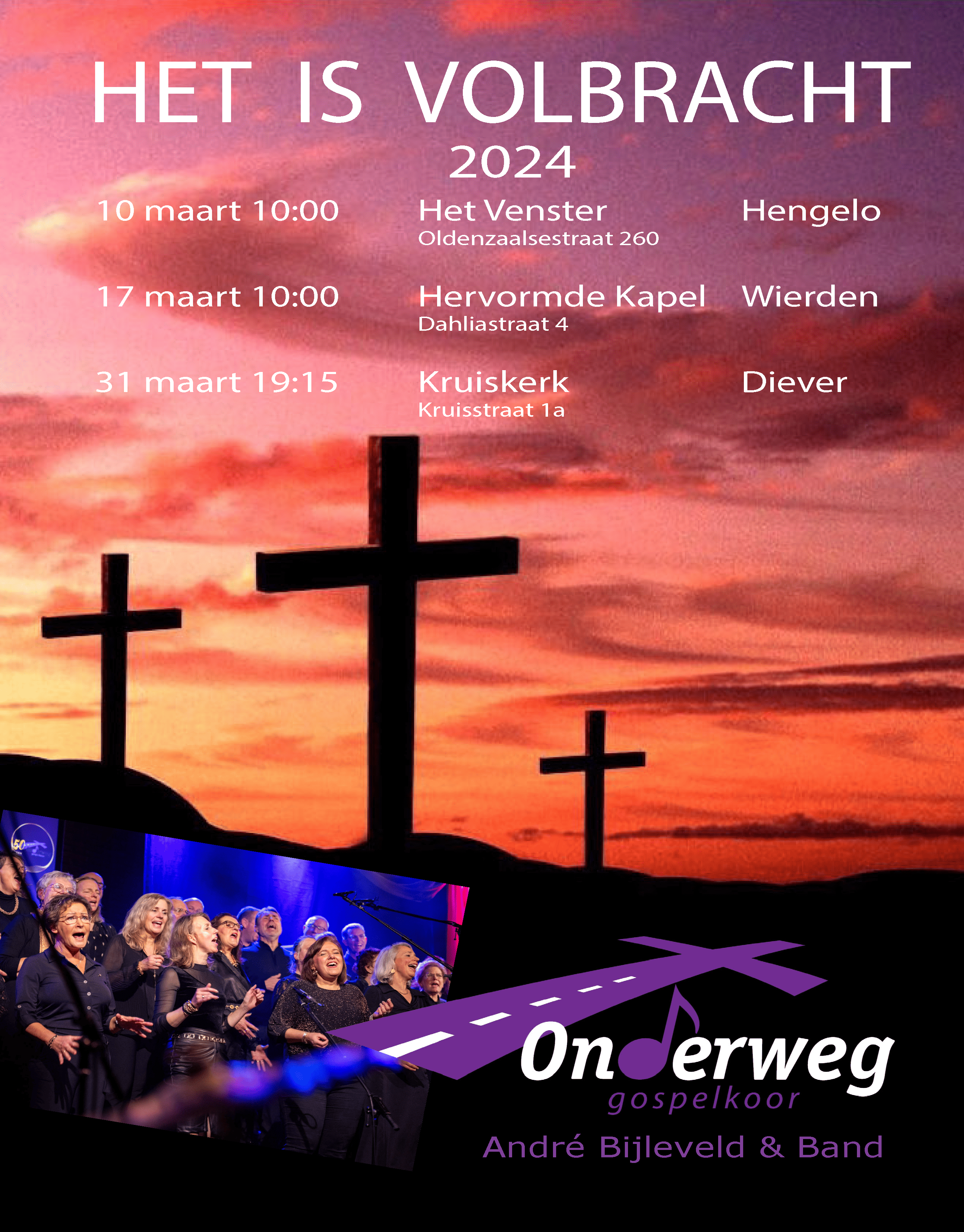 Zondag 31 maart – 19.15 uur – Kruiskerk Diever: Gospelkoor Onderweg uit Almelo met professionele band, onder leiding van dirigent André Bijleveld brengt ten gehore hun Paasproject: