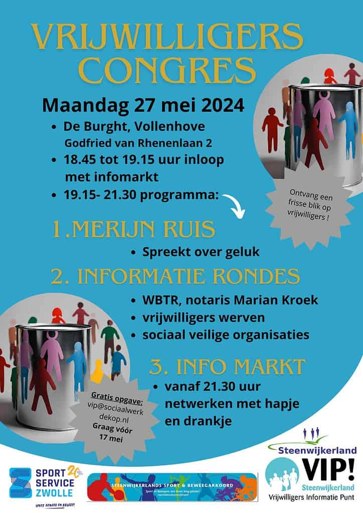 VIP Steenwijkerland, verenigingsondersteuners (sport) en de cultuurmakelaar hebben de handen in één geslagen. Zij organiseren samen het vrijwilligerscongres. Bestuursleden van een koor, historische vereniging, toneelvereniging of andere vrijwilligersorganisaties zijn van harte welkom!