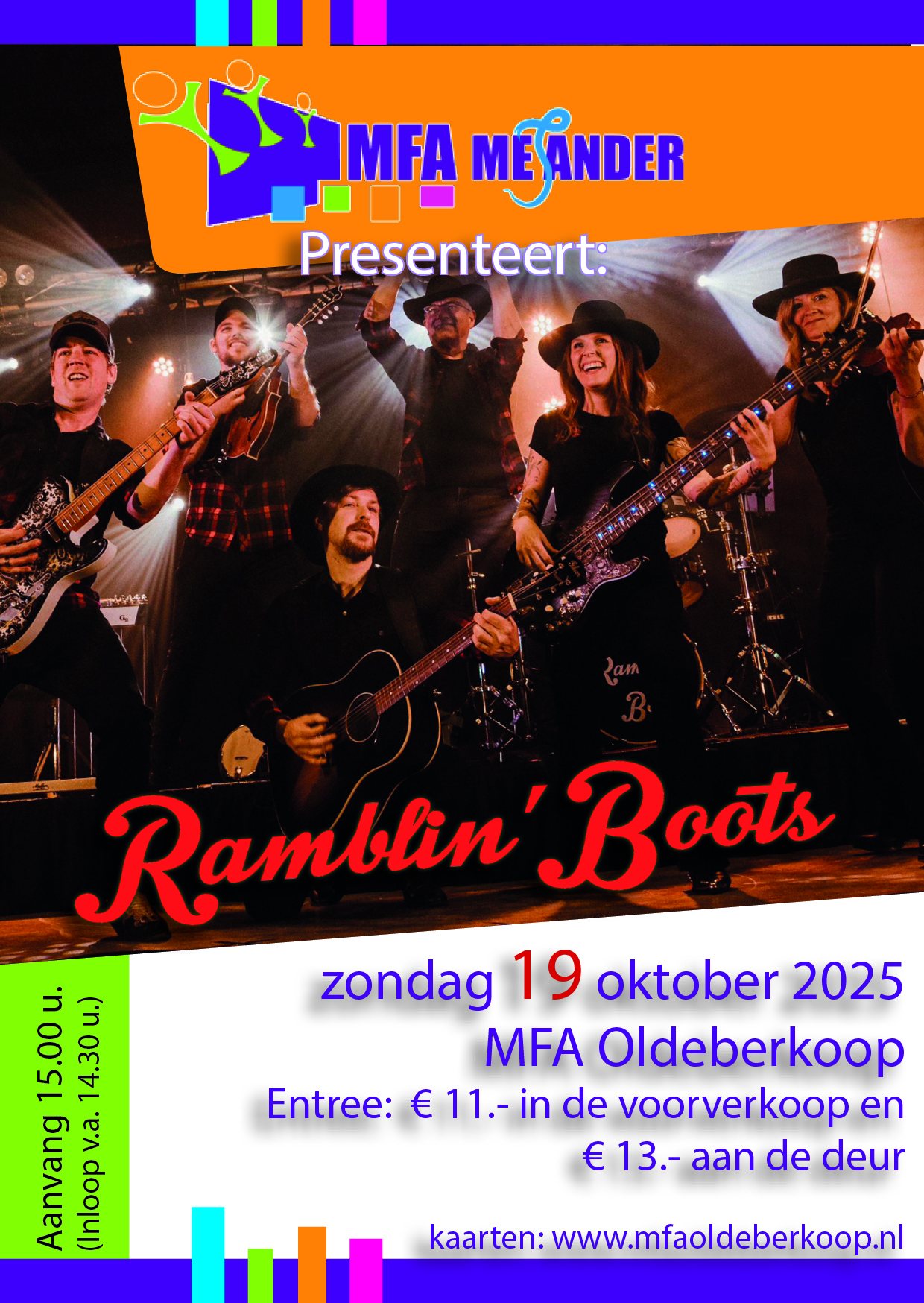 Dit optreden van the Ramblin’ Boots in MfA MeJander begint, zoals gewoonlijk, weer om 15:00 uur en de entree bedraagt ook nu weer € 11.- in de voorverkoop (www.mfaoldeberkoop.nl) en € 13.- aan de zaal.