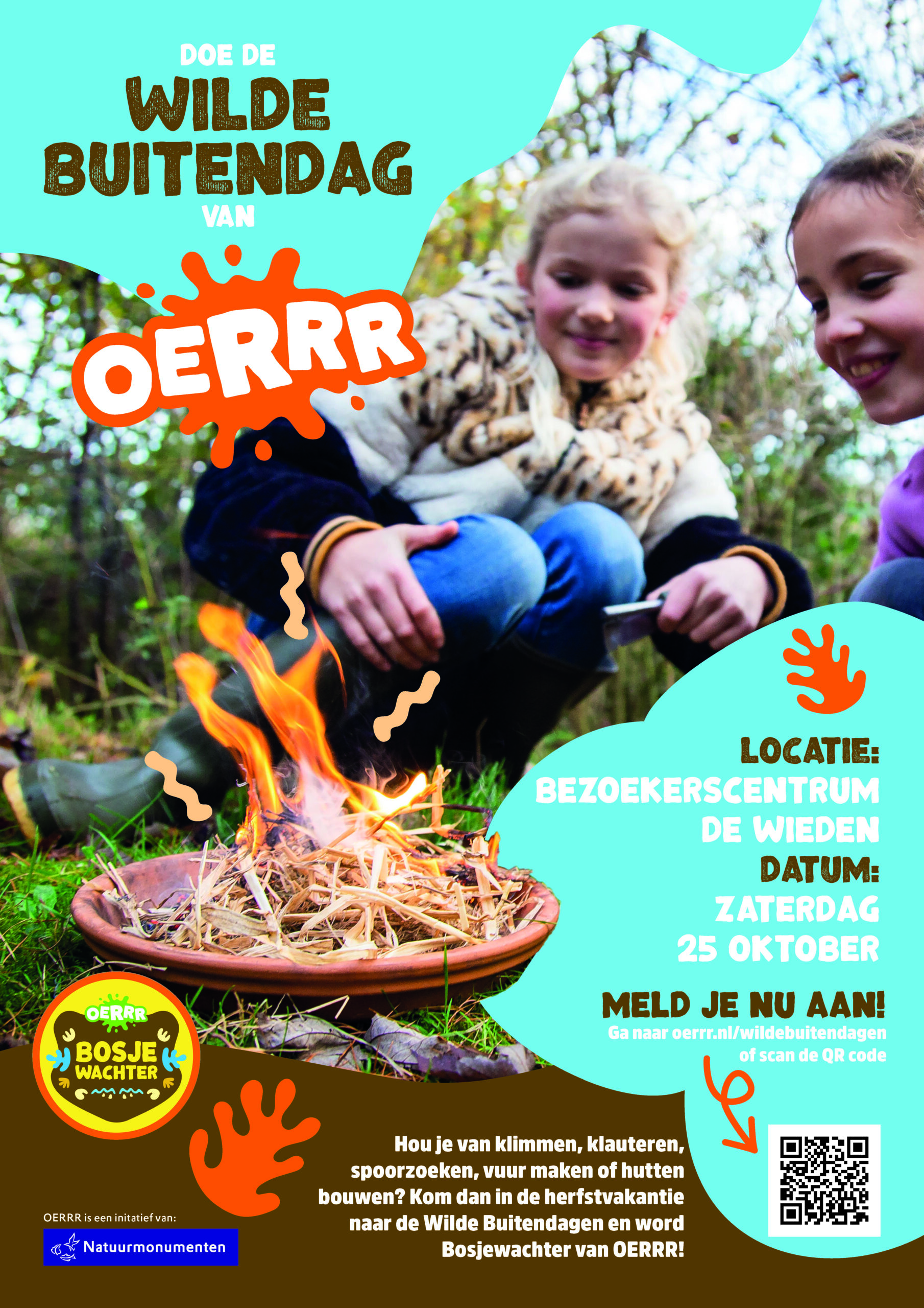 Altijd al willen leren hoe je een schuilhut bouwt? Sporen kan herkennen of vuur maakt zonder lucifers? In de herfstvakantie organiseren de boswachters van Natuurmonumenten de Wilde Buitendagen van OERRR. Kom op zaterdag 25 oktober naar Bezoekerscentrum De Wieden in Sint Jansklooster en beleef een stoere buitendag vol avonturen in de natuur. Kom klimmen, klauteren, bouwen en sjouwen en nog veel meer! Verzamel alle stempels en ontvang na afloop het enige echte Bosjewachter diploma van OERRR.