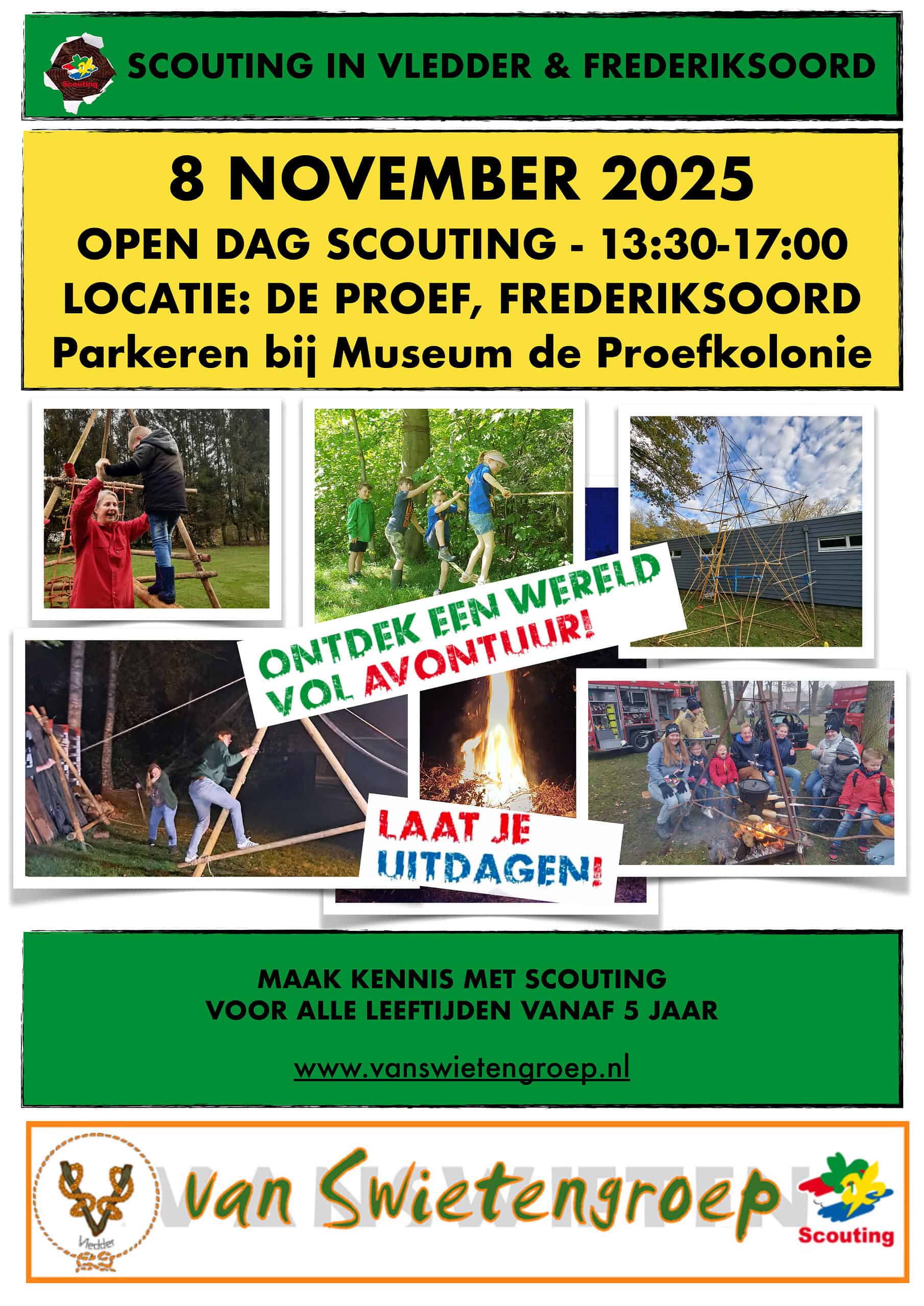 Op 8 november willen we graag aan de samenleving laten zien wat voor een mooie scoutinggroep we hebben en wat we allemaal doen. Hier kan men geïnformeerd worden over onze scoutinggroep door te kijken en mee te doen met de activiteiten die georganiseerd worden. Wellicht zoekt u nog een leuk activiteit voor uw kind of uzelf, of wilt u zich als vrijwilliger inzetten binnen een van de speltakken?
