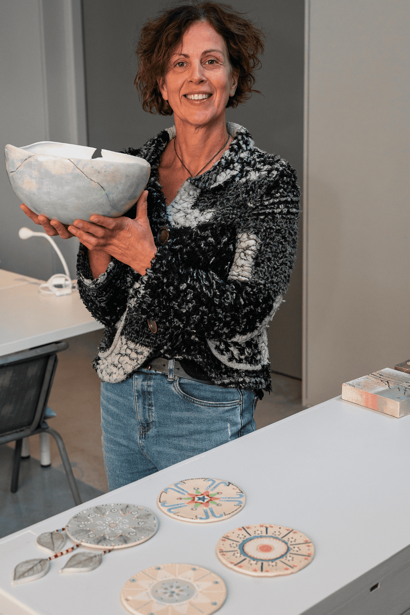 Een vrouw houdt een handgemaakt keramisch kunstwerk vast, omringd door diverse keramische decoraties en unieke keramiekstukken op RTV SLO.