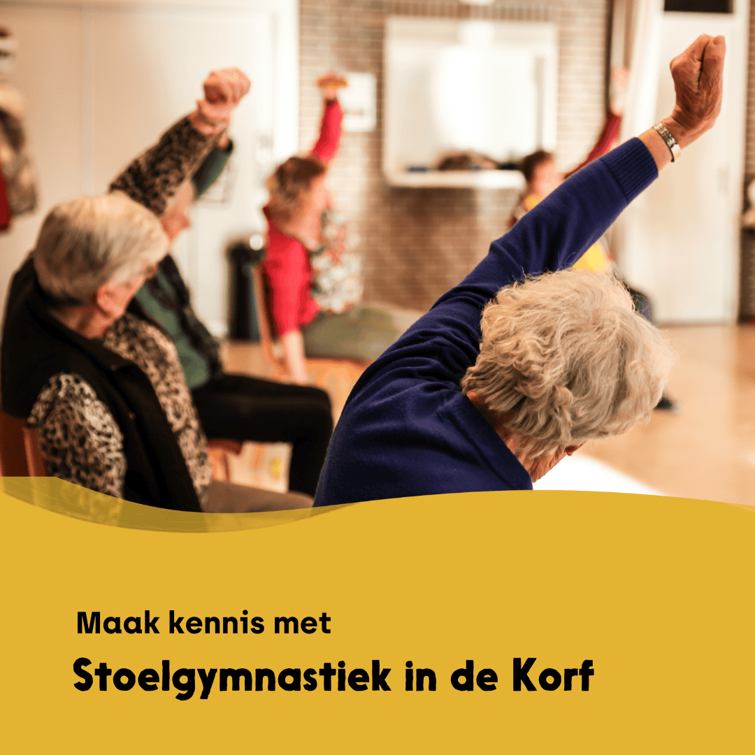 In januari kan je kennis maken met stoelgymnastiek bij Wijkactiviteitencentrum De Korf. Stoelgymnastiek is een laagdrempelige manier van bewegen, speciaal voor inwoners die niet lang kunnen staan of balansproblemen hebben. Stoelgymnastiek is een zachte manier van bewegen die gericht is op het verbeteren van kracht, lenigheid, mobiliteit en fitheid. Het doel is om de zelfstandigheid te vergroten en spieren en gewrichten soepel te houden. Tijdens de les wordt er bewogen op ieders eigen niveau: de oefeningen zijn aanpasbaar aan de individuele mogelijkheden van de deelnemer. Alles gebeurt onder deskundige leiding van een gediplomeerde MBvO (Meer Bewegen voor Ouderen) docent.