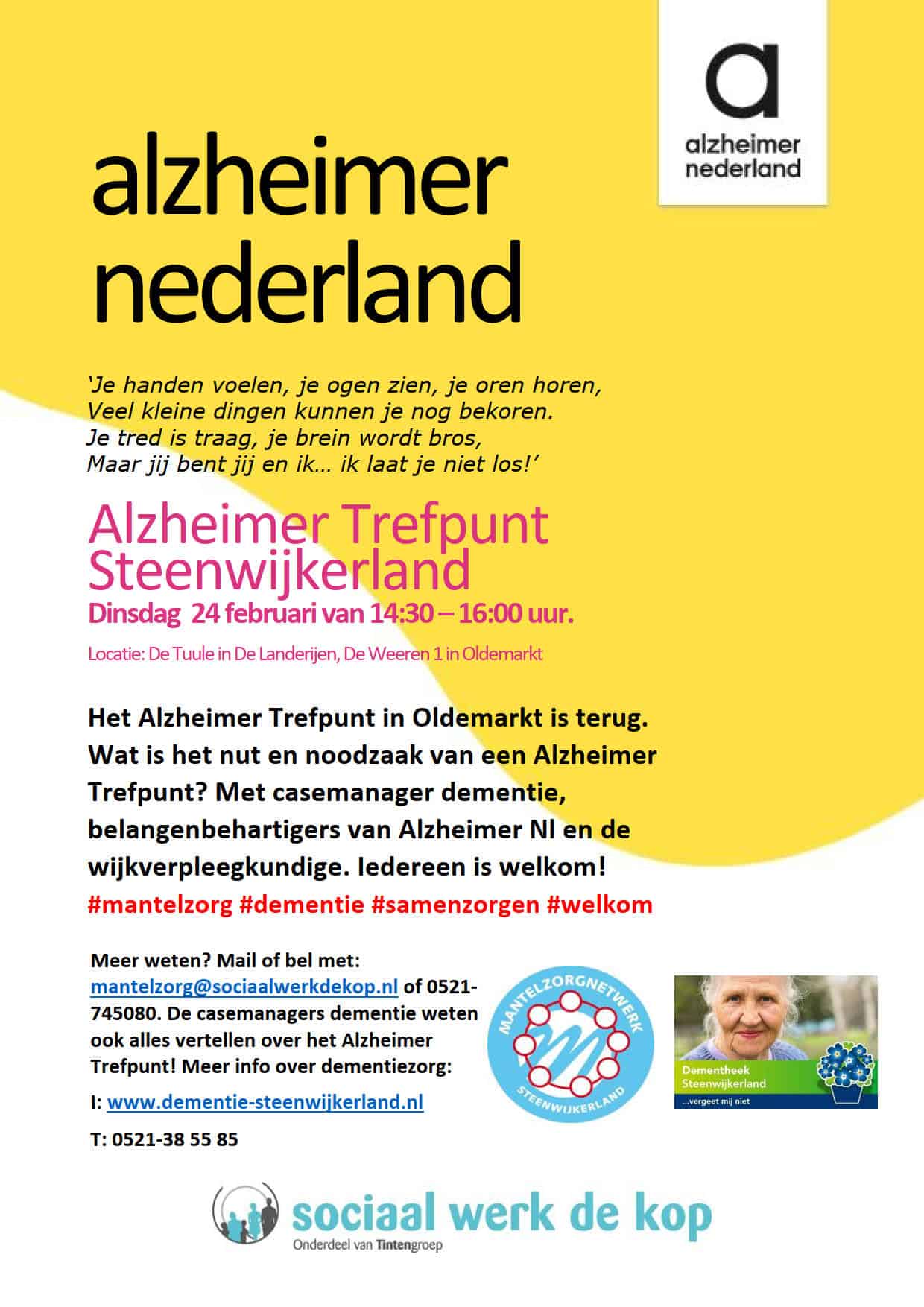 Het Alzheimer Trefpunt in Steenwijkerland is een plek voor mensen met dementie, hun partners, mantelzorgers, familieleden en vrienden. Ook hulpverleners en andere belangstellenden zijn van harte welkom, de koffie staat klaar. Aanmelden is niet nodig en er zijn geen kosten aan verbonden. Het Trefpunt is van 14:30-16:00 uur in de Tuule in de Landerijen. op. Doel is lotgenotencontact, informatie uitwisselen en een stukje gezelligheid. Samen bouwen aan een dementievriendelijk Steenwijkerland. Het Alzheimer Trefpunt Steenwijkerland wordt georganiseerd door de belangenbehartigers en vrijwilligers van Alzheimer Nederland, Sociaal Werk De Kop en de casemanagers dementie. Meer info via mantelzorg@sociaalwerkdekop.nl of 0521-745080.