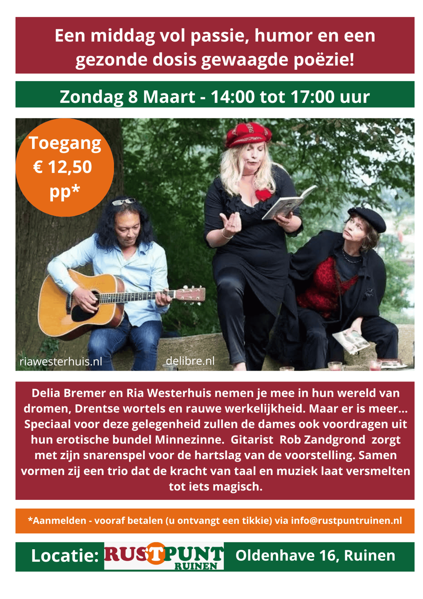 RUINEN – Wat krijg je als je twee eigenzinnige woordkunstenaars en een virtuoze gitarist samen op het podium zet? Een voorstelling die je nog lang bijblijft. Op zondag 8 maart brengen Delia Bremer en Ria Westerhuis samen met gitarist Rob Zandgrond een middagvullend programma bij Rustpunt Ruinen. Bezoekers kunnen rekenen op een mix van dromen, Drentse wortels en rauwe werkelijkheid, met daarnaast een verrassend extra element: de dames dragen ook voor uit hun erotische bundel ‘Minnezinne’. Het belooft een middag te worden vol passie, humor en een gezonde dosis gewaagde poëzie.