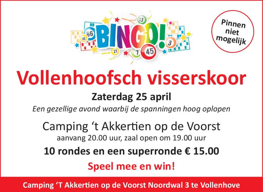 Het Vollenhoofsch Visserskoor organiseert op zaterdagavond 25 april een gezellige avond vol spanning en plezier op camping ’t Akkertien op de Voorst aan de Noordwal 3 in Vollenhove.
