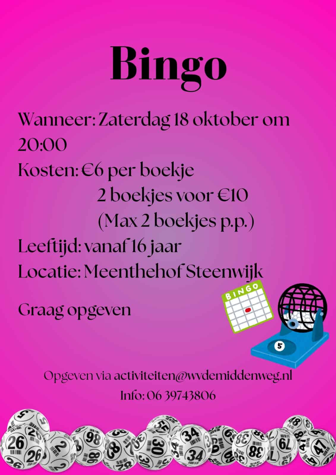18okt20:00BingoGezellige bingo met leuke prijsjes.