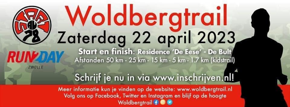 Hardloopevenement door de bossen rond Steenwijk. Afstanden 5-15-25-50 km en een kidsmile. Inschrijven kan via www.Woldbergtrail.nl
